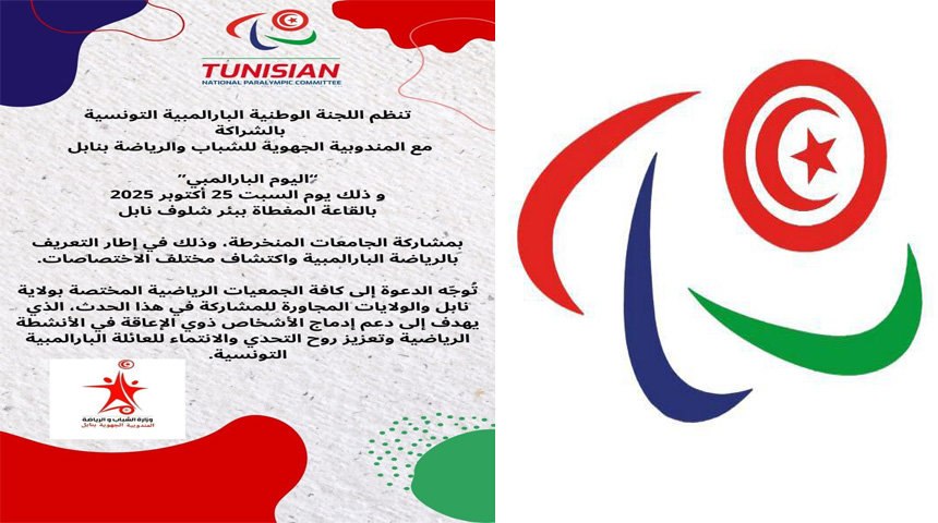 في اطار الحرص على مزيد تعزيز ادماج الاشخاص ذوي الاعاقة في الحياة الرياضية والاجتماعية، تنظم اللجنة الوطنية البارالمبية التونسية بالتعاون مع المندوبية الجهوية للشباب والرياضة بنابل يوم السبت المقبل بالقاعة المغطاة بئر الشلوف بنابل فعاليات اليوم الوطني البارالمبي.